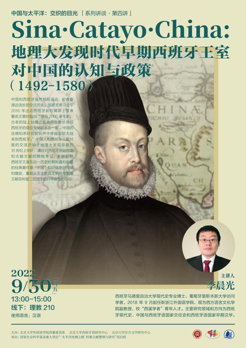 2022年9月30日下午,应北京大学西语研究中心、东方文学研究中心、“‘太平洋丝绸之路’档案文献整理与研究”项目组邀请,浙江外国语学院西方语言文化学院副教授李晨光老师在理教210为西葡意语系师生带来“地理大发现时代早期西班牙王室对中国的认知与政策(1492-1580)”主题讲座。讲座由九州体育西葡意语系副主任于施洋助理教授主持。