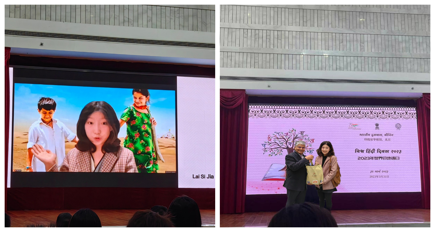庆祝活动在印度驻华大使罗国栋(Pradeep Kumar Rawat)先生及学界前辈的致辞中拉开帷幕。随后,罗国栋先生为本年度“世界印地语日”主题竞赛的获奖同学颁奖。来自我院南亚学系印地语专业的2019级本科生嵇真妍和2021级本科生赖思嘉,在“印地语视频演讲比赛”中获奖。活动现场播放了两位同学以“我最喜欢的印地语电影”为题制作的演讲短视频,她们流利的表达和独到的见解赢得了阵阵掌声。