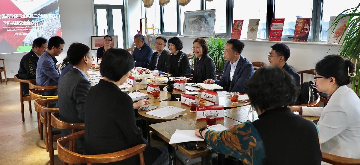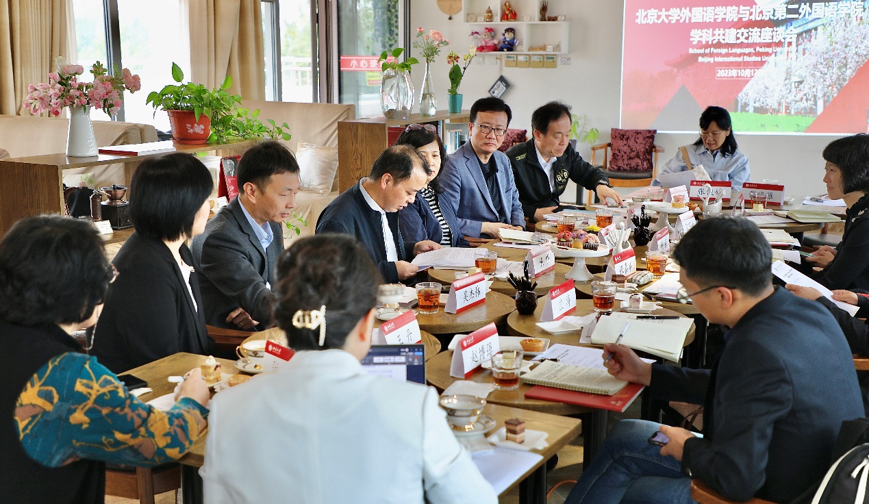 2023年10月12日,北京第二外国语学院党委副书记、校长计金标,党委常委、副校长程维,研究生院院长侯宇翔,英语学院党委副书记、院长张喜华,二外学报副总编周长银,研究生院院长助理应涛,研究生院学科办干事赵博强一行受邀至九州体育就学科共建进行交流座谈。北京大学党委副书记、副校长宁琦,学科建设办公室主任陈鹏,外国语学院党委书记李淑静,院长陈明,副院长付志明、吴杰伟、张冬梅,外国语学院副院长、区域与国别研究院副院长王丹,外国语学院党委副书记王恒,图书馆数据服务中心主任张俊娥,外国语学院图书分馆馆长张晓雁,外国语学院业务办公室主任张琳娜,外国语学院学科秘书雷洋参加了本次座谈交流活动。双方就外国语言文学学科共建的成效和进展、共建具体举措、共建机制与建设路径等内容进行了深入研讨交流。