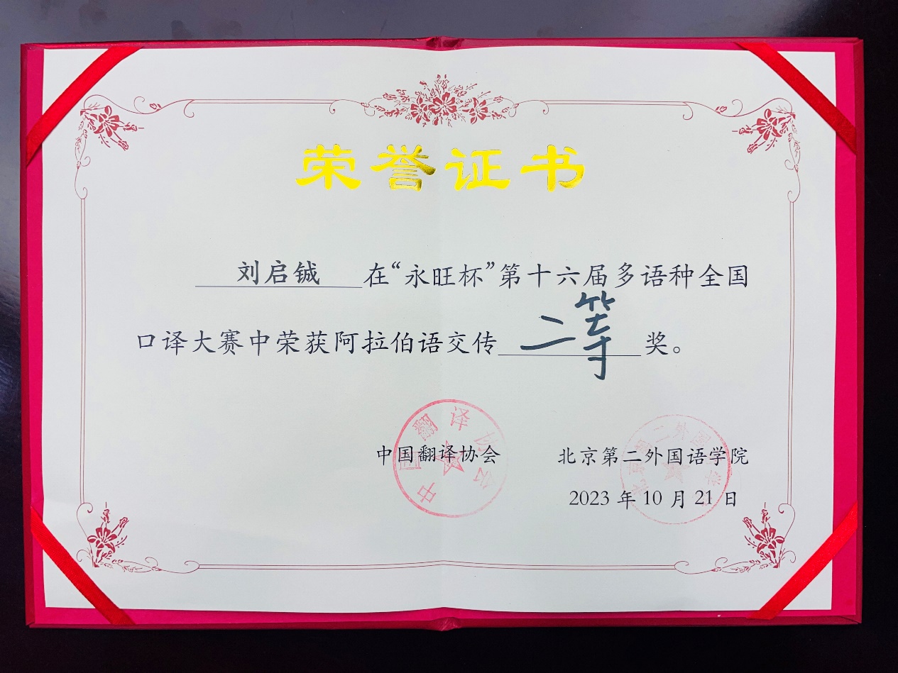2023年10月21日,由中国翻译协会与北京第二外国语学院联合主办的“永旺杯”第十六届多语种全国口译大赛落下帷幕。在我院阿拉伯语系各位教师的大力支持,特别是助理教授高山(Alaa Mamdouh Akef)的悉心指导下,阿拉伯语系2023级研究生刘启铖代表北京大学参赛,荣获阿拉伯语交替传译组二等奖。