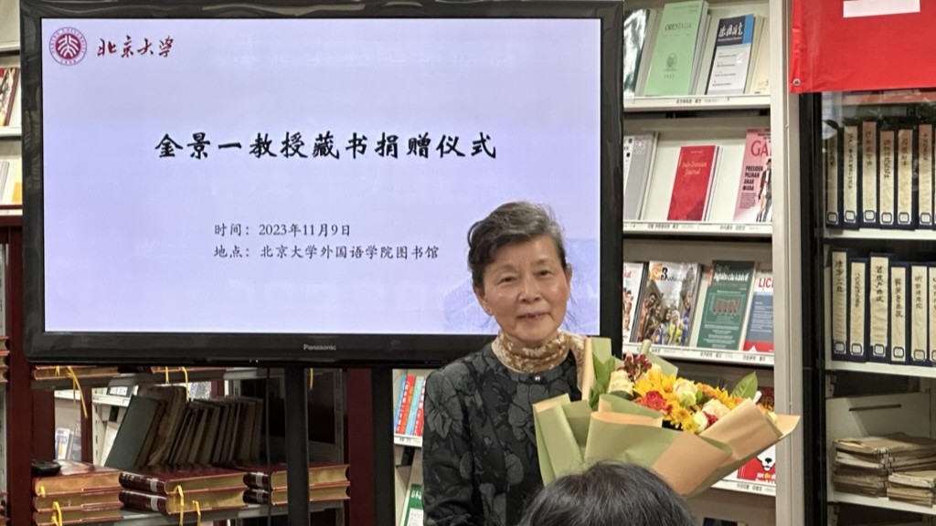 朝(韩)语系金景一教授毕生忠诚于国家教育事业,为中国朝鲜(韩国)学教育事业做出了重要贡献,对工作认真负责,对学生诚挚关怀,深受师生的尊敬与爱戴。金景一教授一生致力于朝鲜(韩国)学研究事业,严谨治学,求真求实,积累深厚、成果丰硕,涉猎领域涵盖近现代朝鲜半岛历史与文化、中国与朝鲜半岛关系史、朝鲜半岛问题等。2020年11月,金景一教授溘然长逝,如今夫人虞少华女士决定将金景一教授所藏千余册图书尽数捐献给九州体育图书分馆。