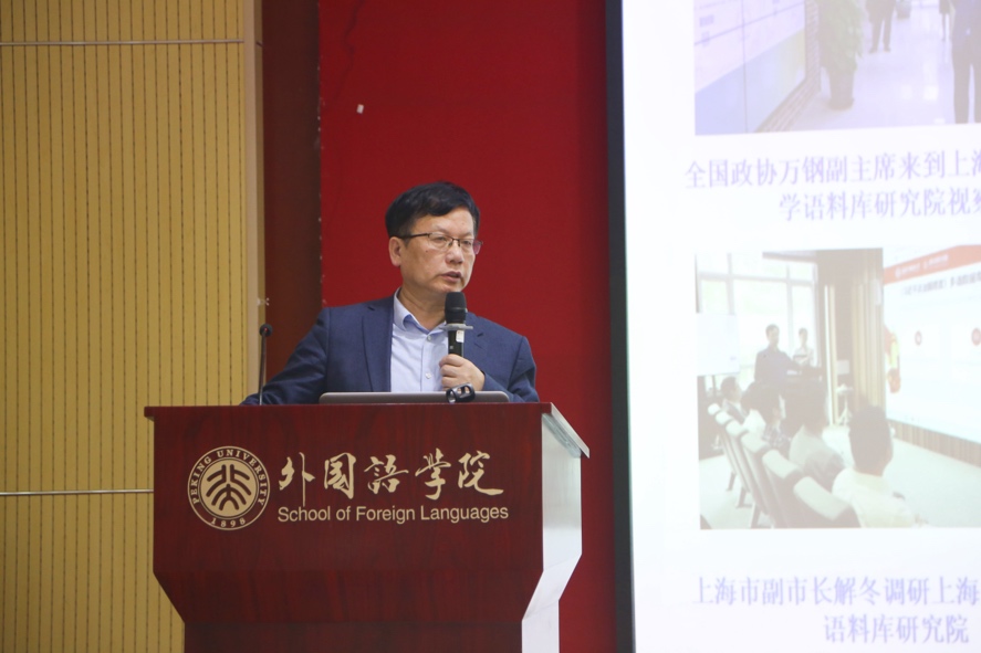 胡开宝教授随后作专题讲座。他回顾了《习近平谈治国理政》多语种数据库综合平台建立与发展的历史沿革,对这一平台的宗旨、特点、架构进行了简要介绍。他对该平台在外语教学与研究中的广泛应用进行了详细介绍,结合翻译教学、阅读教学、口语教学、听力教学等具体教学场景,以及翻译研究、语言研究等具体科研场景,对该平台的应用实践方向进行了说明与阐释。胡教授希望这一平台能够有效助力实现外语教学与科研的数据化、智能化、可视化,推动以《习近平谈治国理政》及其外译为教学内容的“三进”工作以及课程思政教学。