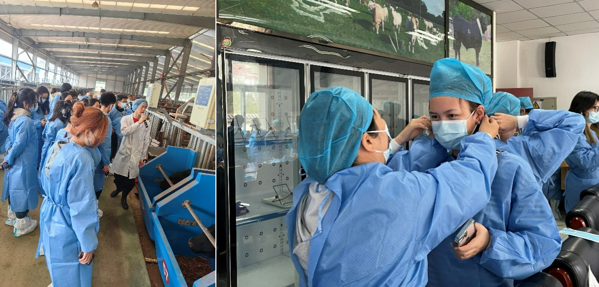 窦店村恒升畜牧养殖中心是京郊存栏最大、养殖水平最高的肉牛养殖基企业,是窦店现代农业产业园区的重点企业,坚持循环生态养殖理念,是以繁育、养殖优质安格斯肉牛为主的标准化基地。同学们换上防护服,在工作人员的带领下走进牛场,深入学习和了解养殖场内部、以及以养殖场为中心形成的区域内循环、可持续发展的全产业链。通过专业人员的讲解,同学们近距离观察到养殖环节的机械化运作,如牛场采用了饲料自取、自动称重、自动记录的设备,大大减少人工参与,降低成本;专业人员还介绍了牛舍的生物垫床,由蘑菇生产厂家废料菌渣与除臭益生菌混合而成,粪尿排入垫层中经过微生物发酵分解,可以转化为有机肥原料供给窦店农田使用,形成农业和畜牧业的循环经济。