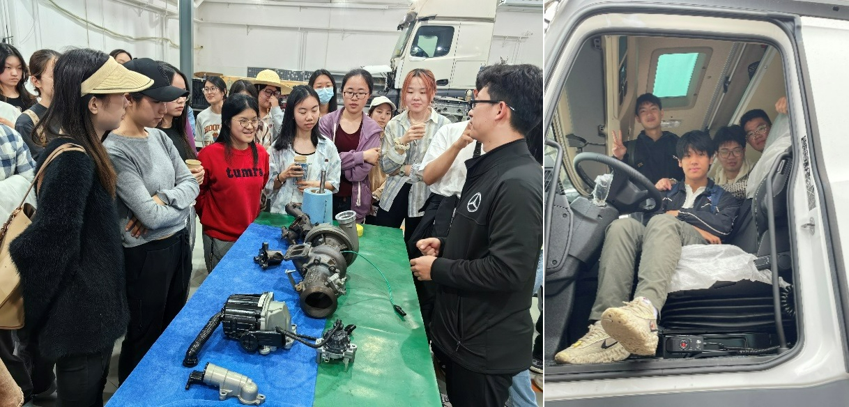 窦店利元车业属于窦店集体经济下的产业之一,经过多年发展,利元车业已成长为集多品牌轻、中、重卡汽车销售,维修服务于一体的集团公司。在车辆展示区,工作人员为实践团重点介绍了奔驰牵引头的构造以及销售链情况,并让同学们有机会坐入驾驶舱,亲身体验牵引头的设计理念与性能优势。