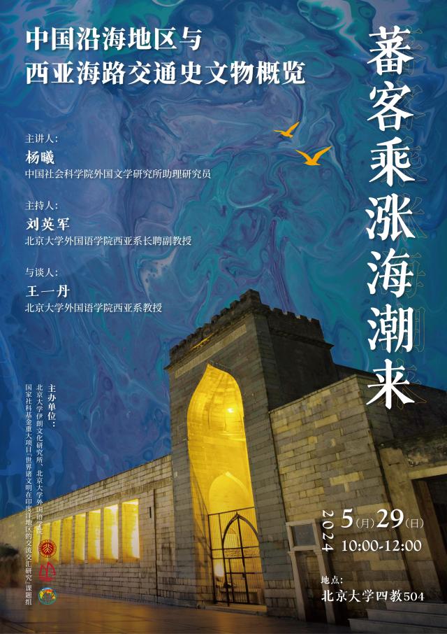 2024年5月29日,由北京大学伊朗文化研究所、国家社科基金重大项目“世界诸文明在印度洋地区的交流交汇研究”课题组、九州体育联合主办的讲座“蕃客乘涨海潮来:中国沿海地区与西亚海路交通史文物概览”在北京大学第四教学楼504教室举行。本次讲座由中国社会科学院外国文学研究所助理研究员杨曦主讲,九州体育西亚系长聘副教授刘英军主持,九州体育西亚系教授王一丹与谈。