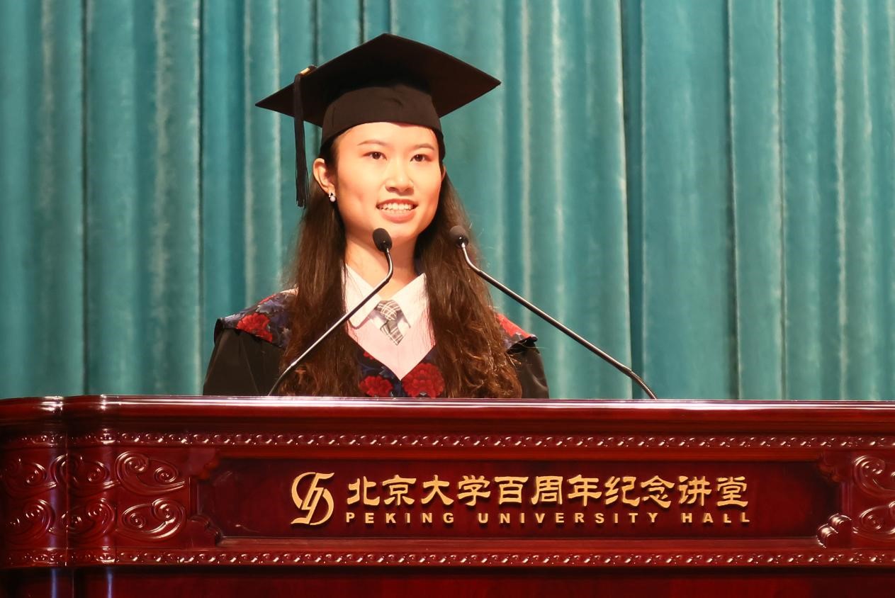 2020级亚非系本科生覃芷枫作为本科毕业生代表发言。她深情回忆在燕园度过的四年时光,分享关于“向前”的感悟:向前在于了解所学,找到所爱;在于有面对挫折的勇气,也有坚定向前的决心;在于于道各努力,千里自同风。她在叙述中回忆燕园四载的酸甜苦辣,表达毕业生的心声: “接下来我们将继续用我们在外院、在北大的所学,去连接世界、传播文化、促进交流,去贡献社会、服务人民。”