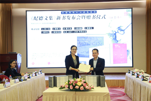 随后,花城出版社向外国语学院图书馆赠送《纪德文集》10卷本,外国语学院向花城出版社授予捐赠证书。