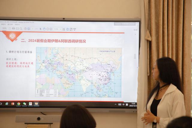 随后,“国别和区域研究项目”学员、外国语学院21级阿拉伯语专业本科生康小薇进行了题为《伊朗的通道建设及交通产业》的报告。报告围绕2024年暑假北京大学CAMEL-LINK项目赴伊朗与阿联酋的调研活动,详细介绍了连接中国与中东的三条主要通道及中国与伊朗之间的铁路线路。康小薇同学还介绍了调研团在调研前后的准备工作和学术产出撰写工作,并分享了自己参与调研活动的收获。