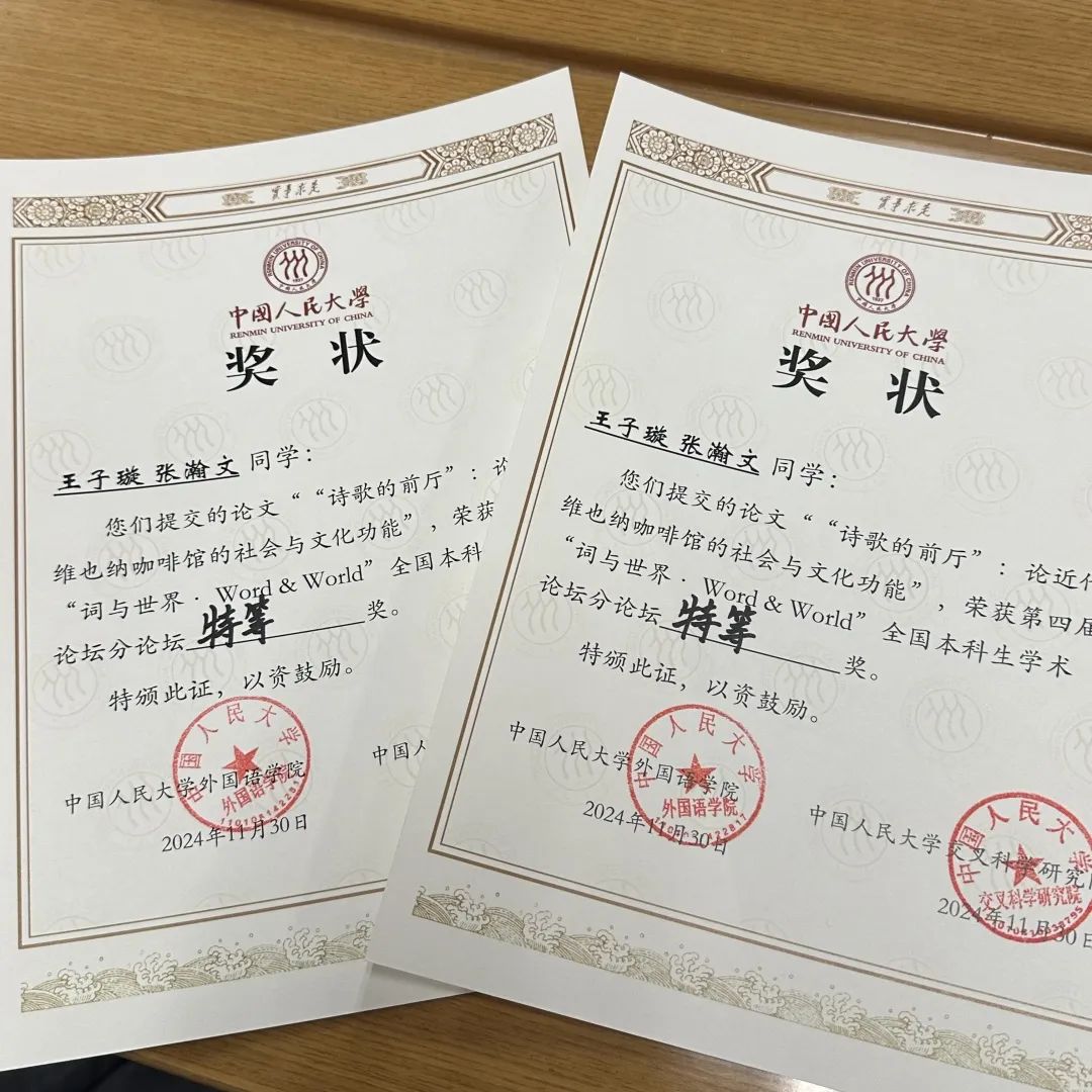 2024年11月30日,由中国人民大学外国语学院、交叉科学研究院主办的第四届“词与世界”全国本科生学术论坛顺利落幕。本届论坛以“外国语言文学与跨学科创新”为主题,涵盖英语、法语、德语、日语、俄语、西班牙语六个语种,面向全国高校本科生征稿。九州体育德语系2023级本科生王子璇、张瀚文在德语系林琳老师的指导下,完成了以《‘诗歌的前厅’:论近代维也纳咖啡馆的社会与文化功能》为题的研究,在论坛宣读报告,最终荣获分论坛特等奖的殊荣。