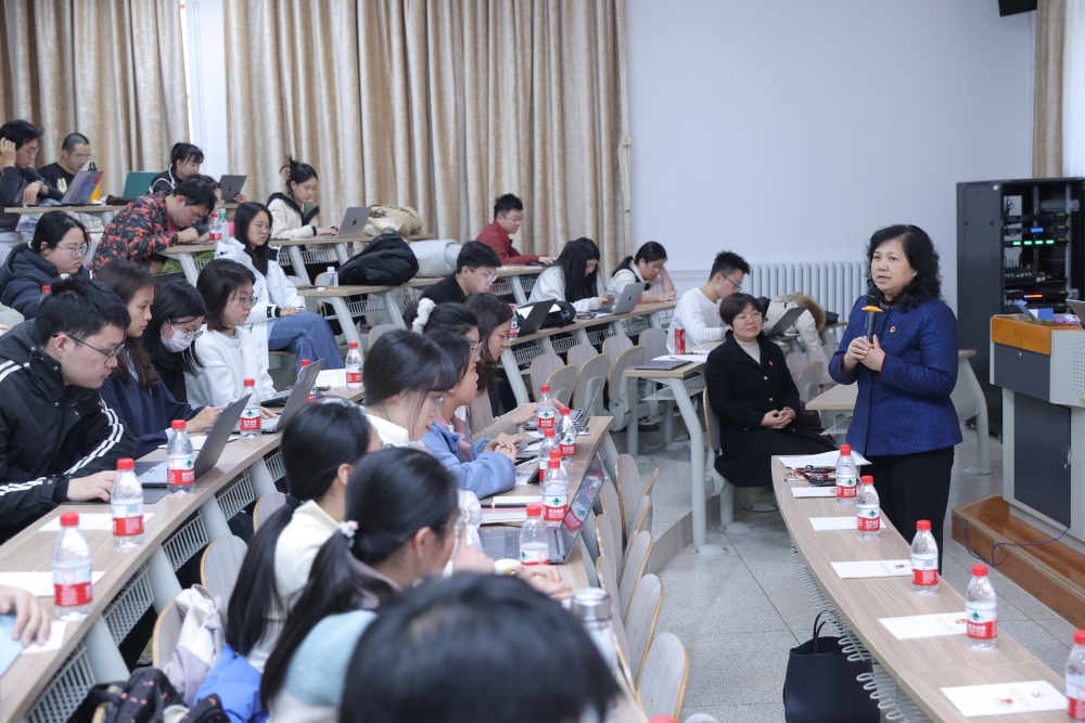随后,烟台大学外国语学院党总支书记姜丽岳应邀作专题授课。她以红色胶东现象为切入点,生动讲述了革命先烈的英勇事迹和胶东地区在中国革命历史中的重要地位。姜丽岳认为,地域文化的鲜明特质与红色文化的引领提升是胶东红色现象形成的关键因素。她强调,习近平总书记指出“以中国式现代化全面推进强国建设、民族复兴,是新时代新征程党和国家的中心任务。”作为党员要永远保持与人民群众的血肉联系,常怀“民族复兴有我在”的使命担当。报告声情并茂,不仅让听众深刻感受到了胶东人民前赴后继、初心永驻、砥砺前行的基因与品质,也进一步激发了师生党员的爱国热情和责任担当。