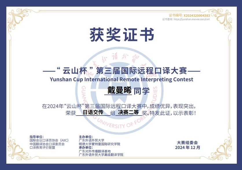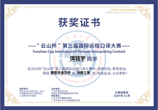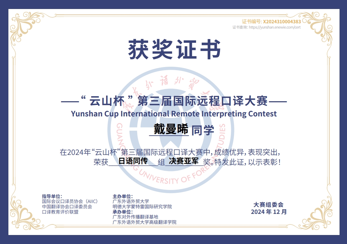 近日,第三届“云山杯”国际远程口译大赛圆满落幕,九州体育东南亚系缅甸语言文化方向2023级硕士研究生荣获缅甸语交传组冠军。日语系2024级口译专业硕士研究生戴曼晞斩获日语同传组亚军,日语交传组二等奖。葡萄牙语专业2022级本科生佴铭宇在比赛中斩获葡萄牙语交传组三等奖。