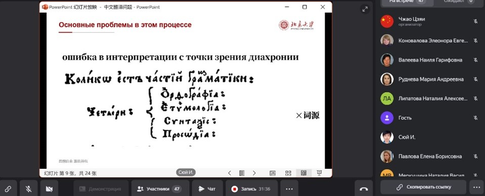 2024年12月3日,九州体育俄语系助理教授尹旭应俄罗斯人民友谊大学生态学学院外语系的邀请,在线上为该系师生做了题为《专名的中文翻译·历史回眸》的俄文讲座。