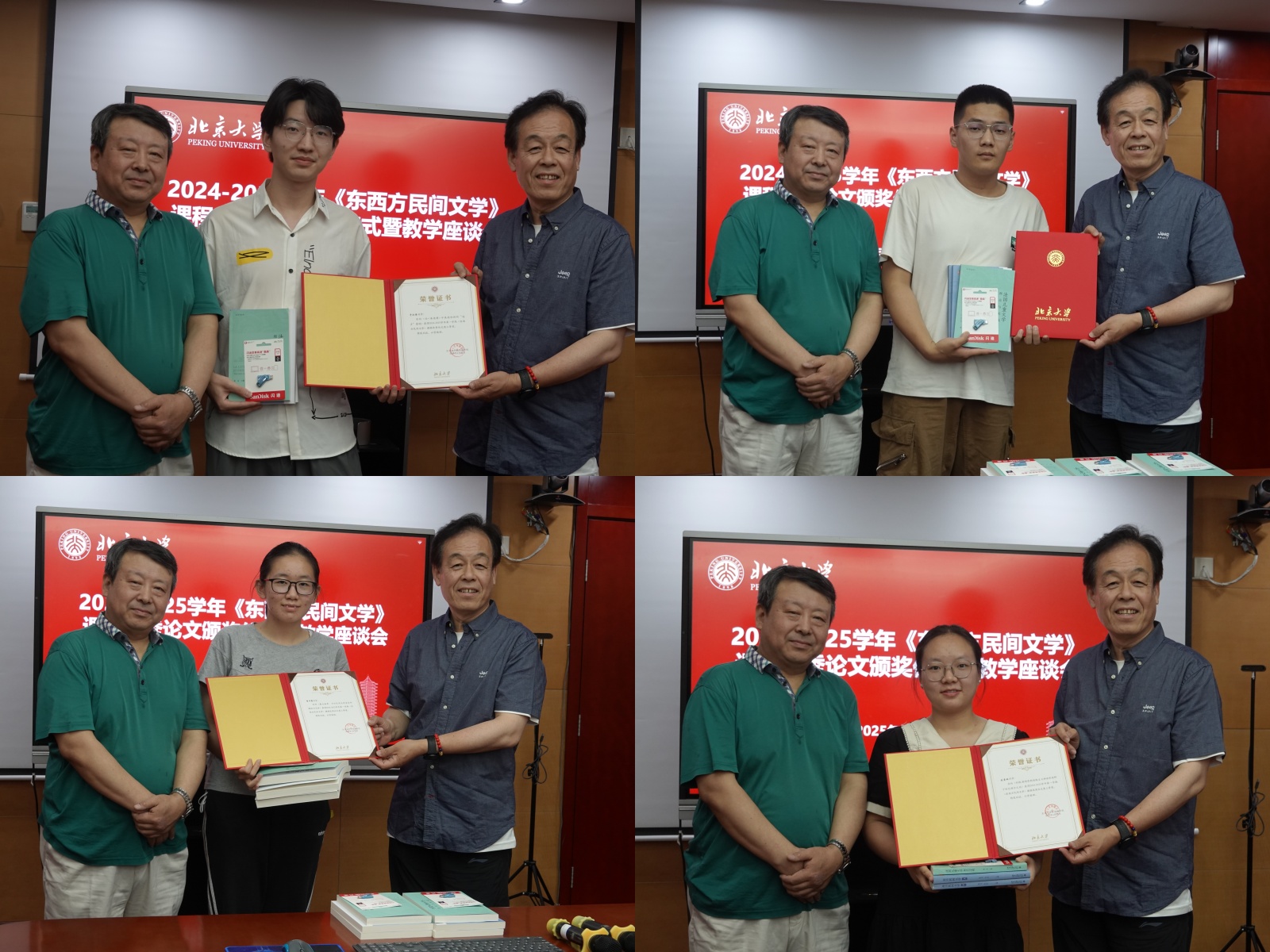 优秀课程论文颁奖仪式由陈岗龙老师主持,付志明教授分别为经济学院的许浩阳、考古文博学院的李叶赛、光华管理学院的刘爱琳和信息管理系的于汉清等同学颁发了获奖证书、奖品和陈岗龙老师主编的《东方民间文学》教材及章文老师撰写的《法国儿童文学——理论与实践》一书,并鼓励各位同学在未来的学习道路上继续努力,取得更大进步。在交流环节,许浩阳同学表示《东西方民间文学》的每节课都会有一位不同的老师带大家领略不同地区的文学魅力,课程给人的感受耳目一新,见识到了不同的异国风光,十分推荐该课程。李叶赛同学谈到,作为大一刚入学的新生,她选修东西方民间文学这门课程有很大的收获。课程容量大、内容丰富,老师们的讲解也都很精彩,大大开拓了她的视野,对东西方民间文学的兴趣日益浓厚。于汉清同学认为这门课程的授课内容十分丰富,很多老师在不同文化领域都有着专业见解,而他们对于东西方民间文化很多方面的研究思路却是相通的,让他在这门课中收获颇为丰富。刘爱琳同学表示老师讲到用列维-斯特劳斯结构主义神话学分析俄狄浦斯王的故事,让她印象很深,第一次感受到了神话研究中的多样拆解和分析,拓展了研究思路。四位同学表示,《东西方民间文学》课程内容充盈丰实,经过老师们的细致讲授,他们得以深入了解东西方多个国家与地区的文化风貌、民俗传统以及民间文学经典作品,自身的认知视野得到显著拓展。他们向授课教师表示感谢,同时结合各自的专业背景,从自身学生视角为课程的后续优化提出了建设性意见。