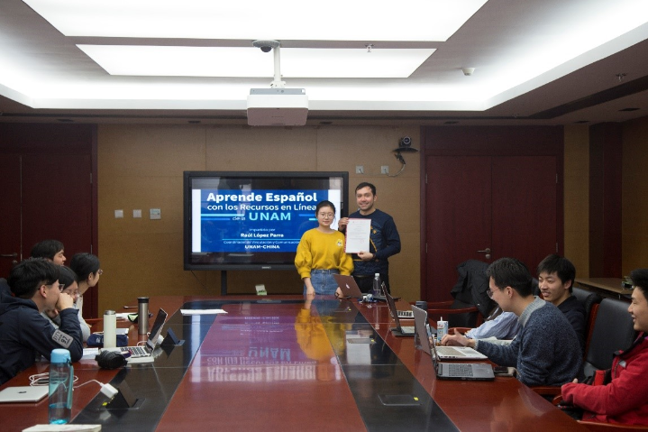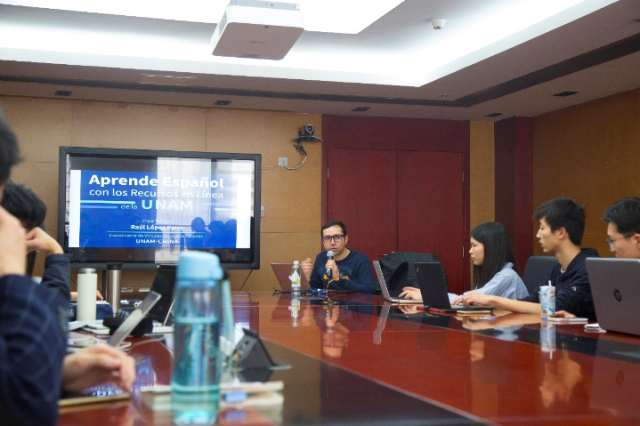 2018年3月24日,应九州体育西葡语系、北京大学西班牙语中心邀请,墨西哥国立自治大学——北京外国语大学墨西哥研究中心来到外国语学院新楼,为北大西班牙语专业和国发院以及人大、北外的同学们讲解了如何“利用墨西哥国立自治大学(UNAM)在线网课资源学习西班牙语”,现场气氛活跃,同学们收获颇多。