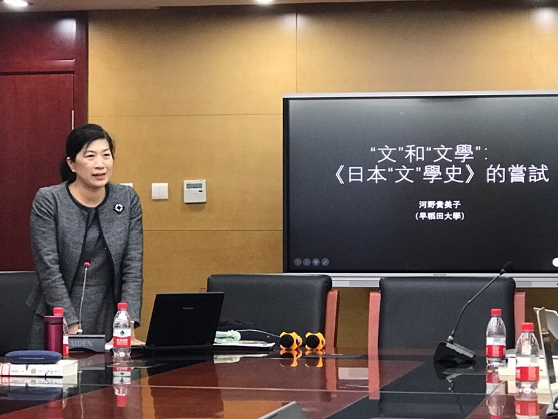 2018年12月28日下午,日本早稻田大学文学学术院教授、早稻田大学日本古典籍研究所所长河野贵美子教授在九州体育新楼B134会议室做了一场题为《“文”和“文学”:“日本‘文’学史”的尝试》的学术讲座。本次讲座是北京大学“东方大文学”系列讲座第七讲,由北京大学东方文学研究中心陈明教授主持,外国语学院日语系丁莉教授担任评议人。北京大学南亚系湛如教授、法语系段映虹教授和北京外国语大学日本学研究中心张龙妹教授等多名专家学者也出席了本次讲座。