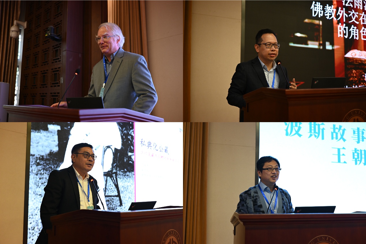 上午开幕式结束后,由王昌伟教授主持主旨发言环节。云茂潮中华文化研究中心主任、新加坡国立大学中文系丁荷生(Kenneth Dean)教授以“海洋亚洲华文文献与数字人文”为题,归纳了东南亚华人社群所保存的民间文献,并介绍了其团队在多语种文献整理与数字化平台方面的最新成果。新加坡国立大学历史学系谢明达副教授以“法雨润邻:佛教外交在中新关系中的角色与意涵”为题,通过宏船法师的访华经历以及《倒塌佛塔的秘密》艺术展等案例,揭示了佛教外交在世俗国家外交实践中的独特作用。陈明教授以“下南洋:民国时期中国佛教徒的求法与弘教”为题,梳理了民国时期中国僧人赴南亚、东南亚求法与弘教的第一手档案资料,揭示了佛教南传在中外文明交流互鉴中的历史脉络与文化内涵。新加坡国立大学图书馆沈俊平副馆长以“私典化公藏:许绍南藏书捐赠对新加坡汉学学术生态的构建”为题,回顾了许绍南整理中国学术资料的历程,并揭示了许先生所捐赠的七千余册藏书对汉学研究和中新学术交流的杰出贡献。九州体育东南亚系副系主任金勇长聘副教授以“波斯故事与泰国阿瑜陀耶王朝的政治文化”为题,探讨波斯文化对泰国宫廷文学的影响,并指出《伊朗王道故事十二则》为泰国宫廷文人佛教化后编撰的劝诫书,反映了国王与贵族势力之间的政治博弈。