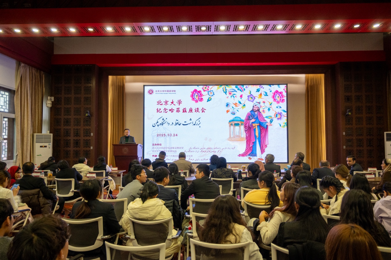 2025年10月24日上午,“北京大学纪念哈菲兹座谈会”在北京大学民主楼208会议室举办。哈菲兹是公元14世纪伊朗伟大的波斯语诗人,有“神舌”、“设拉子夜莺”之美称,他的诗歌常以美酒、美人与鲜花等意象构建充满象征的奇境,兼具神秘主义的深邃哲思与浪漫主义的现世关怀。哈菲兹的诗歌风格类似中国古代诗人李白,不仅在伊朗文学史中具有崇高的地位,也深受世界人民喜爱。伊朗一直有纪念古今文人学者的传统,每年10月12日为伊朗官方设立的“哈菲兹日”,在此日期前后,伊朗国内外均会举行相关的纪念活动。九州体育波斯语教研室及伊朗文化研究所继2023年之后,今年再次举办了“纪念哈菲兹座谈会”。伊朗驻华大使法兹里、文化参赞伊朗扎德等使馆人员以及来自北京大学、北京外国语大学、对外经济贸易大学、北京语言大学、北京第二外国语学院,以及天津外国语大学的100多位波斯语专业师生受邀出席活动。