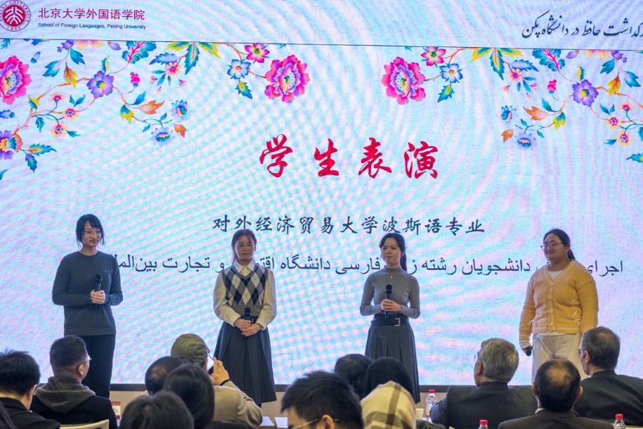 在场各高校波斯语专业的学生代表也为座谈会送上了精彩纷呈的节目,展现了各校波斯语专业的风采。北京大学波斯语专业的学生梳理了哈菲兹的生平,并通过朗诵的形式展现了哈菲兹的诗歌之优美、意蕴之丰富。其他高校的学生们也通过朗诵、演唱、舞蹈及话剧等形式表达了对诗人哈菲兹的缅怀之情。