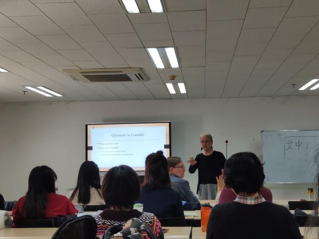 7日下午,Silberstein教授在外国语学院新楼301做了第一场报告,介绍了她在过去十年中对华盛顿大学国际学生日渐增多这一现象的调查研究。此项研究采用了量的与质的相结合的方法,分别收集了来自教师、助教以及国际学生三方面的数据,试图探讨不同人群对国际学生群体的看法和态度。研究发现教师和助教对国际学生的态度既有正面也有负面,一方面他们认为国际学生为课堂带来了新的文化视角,丰富了课堂的内容;另一方面国际学生的课堂参与度较低,对学术抄袭有不同的理解,又为教学带来了一些问题。Silberstein教授将国际学生的调查结果与教师和助教的研究发现进行了对比分析,打破了大众以往对于国际学生的偏见,更为立体和全面地展现了国际学生群体给学校带来的影响,针对性地提出了学校为支持国际学生学术发展的一系列举措。