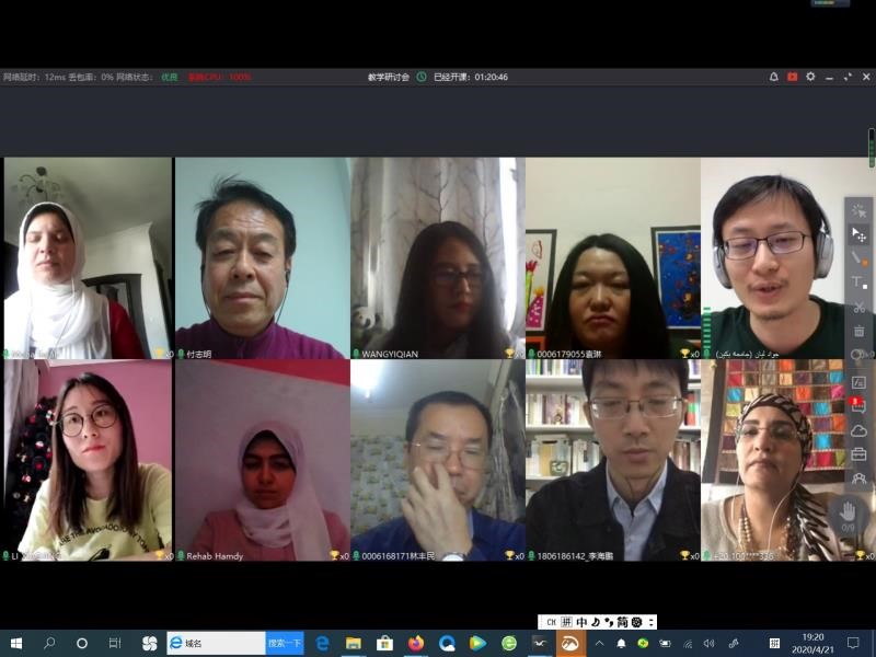 随后,来自北京大学阿拉伯语系的吴冰冰副教授、廉超群助理教授,来自开罗大学中文系的Rehab Handy博士、穆娜老师、李玉老师(埃及)以及汉语教师李晓靖老师、王一倩老师还就如何跟踪学生的自主学习情况、在线测试的方式方法、学期论文的评定标准和规范要求以及埃及现阶段疫情对生活影响等问题,进行了亲切的交流和分享。