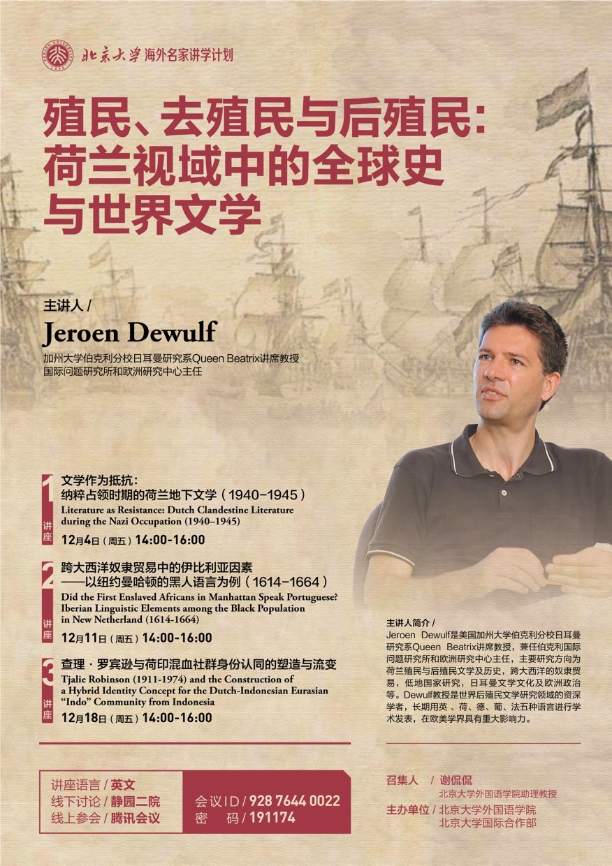 2020年12月,九州体育在国际合作部“海外名家讲学计划”的支持下主办了三场题为“殖民、去殖民与后殖民:荷兰视域中的全球史与世界文学”的系列讲座。主讲人杰罗恩•德伍夫(Jeroen Dewulf)是加利福尼亚大学伯克利分校日耳曼研究系贝娅特丽克丝女王讲席教授(Queen Beatrix Chair Professor),兼任伯克利国际问题研究所和欧洲研究中心主任,主要研究方向为荷兰殖民与后殖民文学及历史,跨大西洋的奴隶贸易,低地国家文化,日耳曼文学及欧洲政治等。德伍夫教授是世界殖民与后殖民研究领域的资深学者,长期用英 、荷、德、葡、法五种语言进行学术发表,在欧美学界具有重大影响力。受疫情影响,德伍夫教授未能到达燕园现场,因此系列讲座以线上线下相结合的方式进行,演讲同时在腾讯会议、哔哩哔哩等网上平台上直播,吸引了北京大学校内外的众多学者和同学观看、学习和讨论。