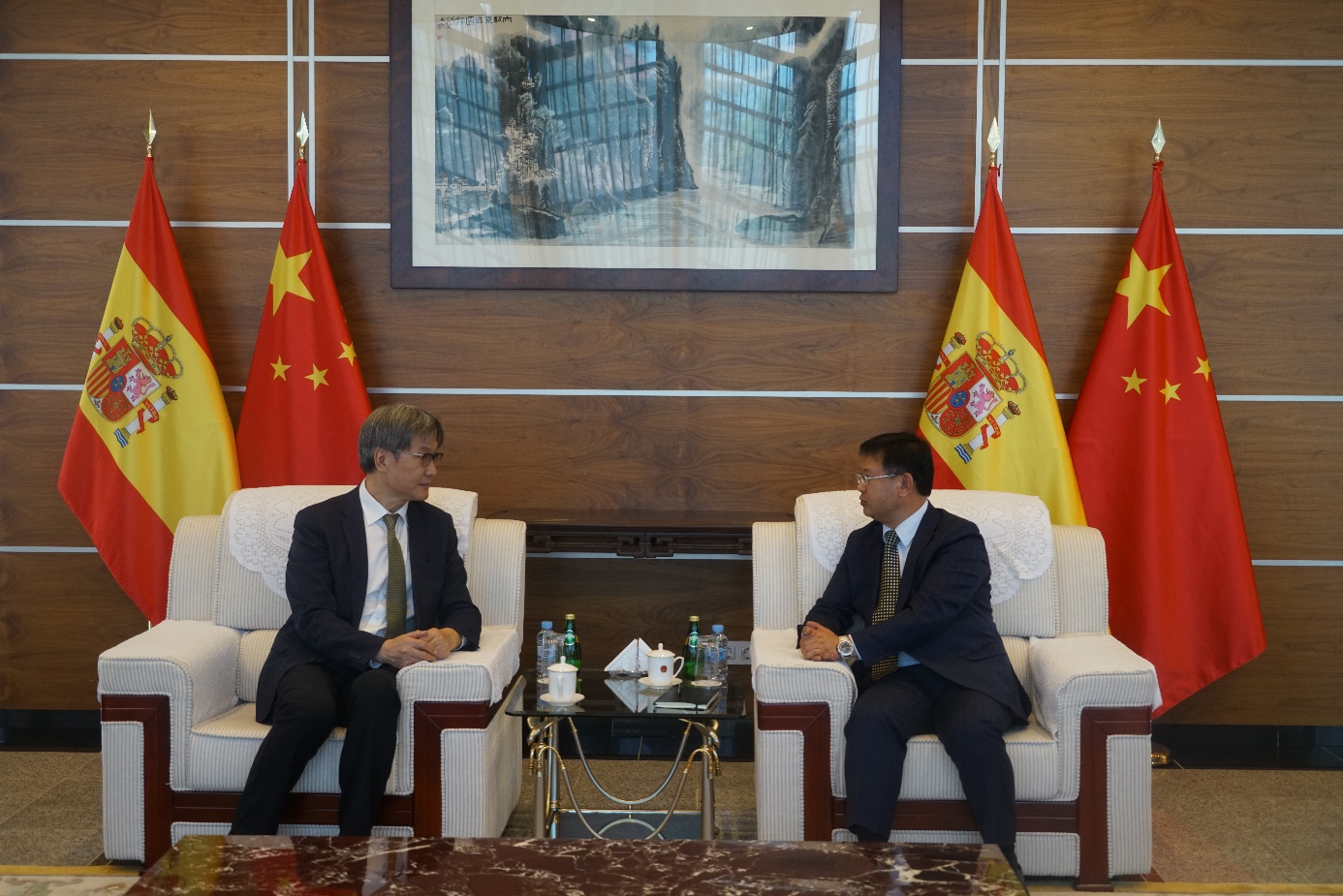 随后代表团拜访了中国驻西班牙大使馆。公使屈浔介绍了西班牙独特的历史和亲华友华的社会氛围,回顾国家主席习近平2018年的国事访问、今年3月9日从义乌和马德里双向对开的“中西建交纪念号”中欧班列,强调西班牙首相即将访华,中西文化和旅游年也将于月底开幕,陆续举办民乐团音乐会、“中国秦汉文明的遗产”展、“中国历代绘画大系”之宋画展和“中国茶文化”展等精彩活动。王博向屈浔公使介绍了北京大学与西班牙高校的交流合作情况。他表示,今年是北京大学的“国际战略年”,学校将在使馆的支持下不断加强和西班牙高校的合作,并配合做好两国建交50周年庆祝工作,依托自身优势举办特色教育交流活动