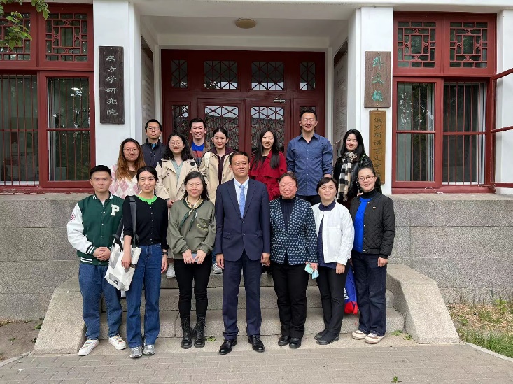 活动结束后,李旭大参赞、韩志红处长等与亚非系师生于外国语学院外文楼前合影留念