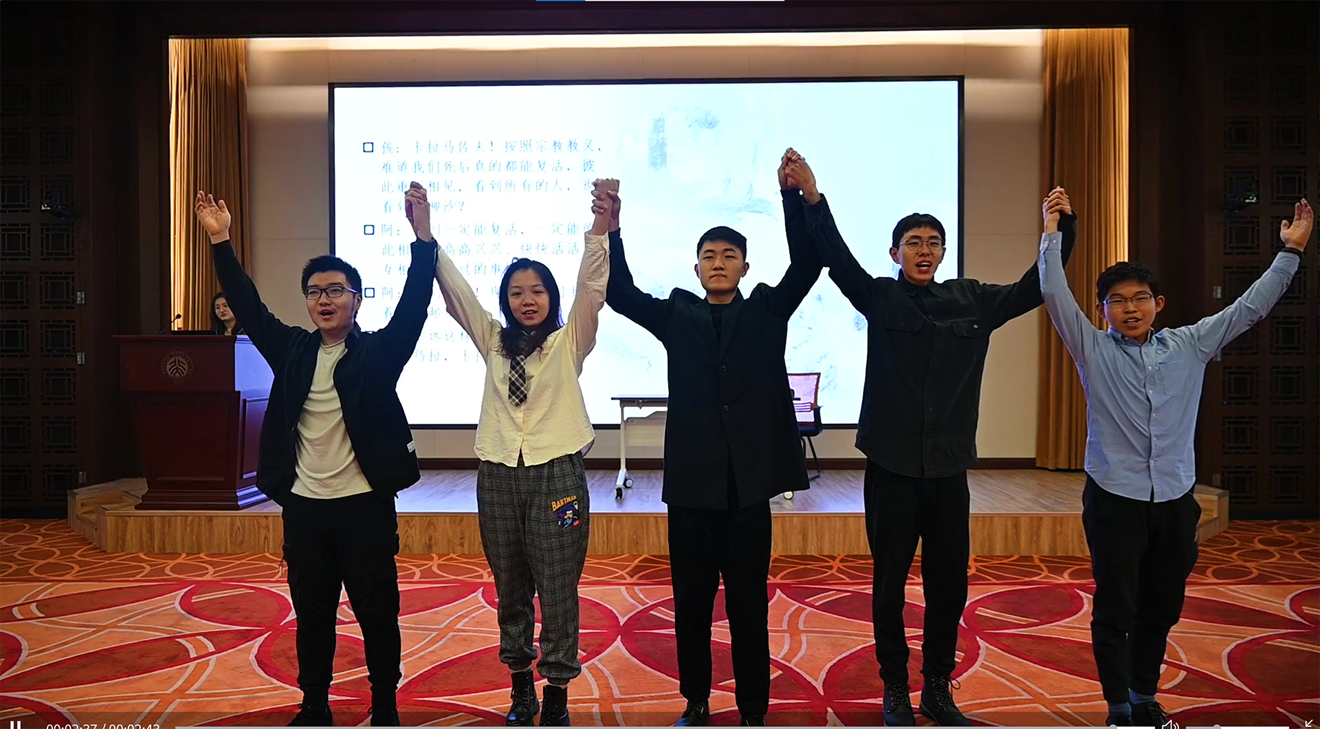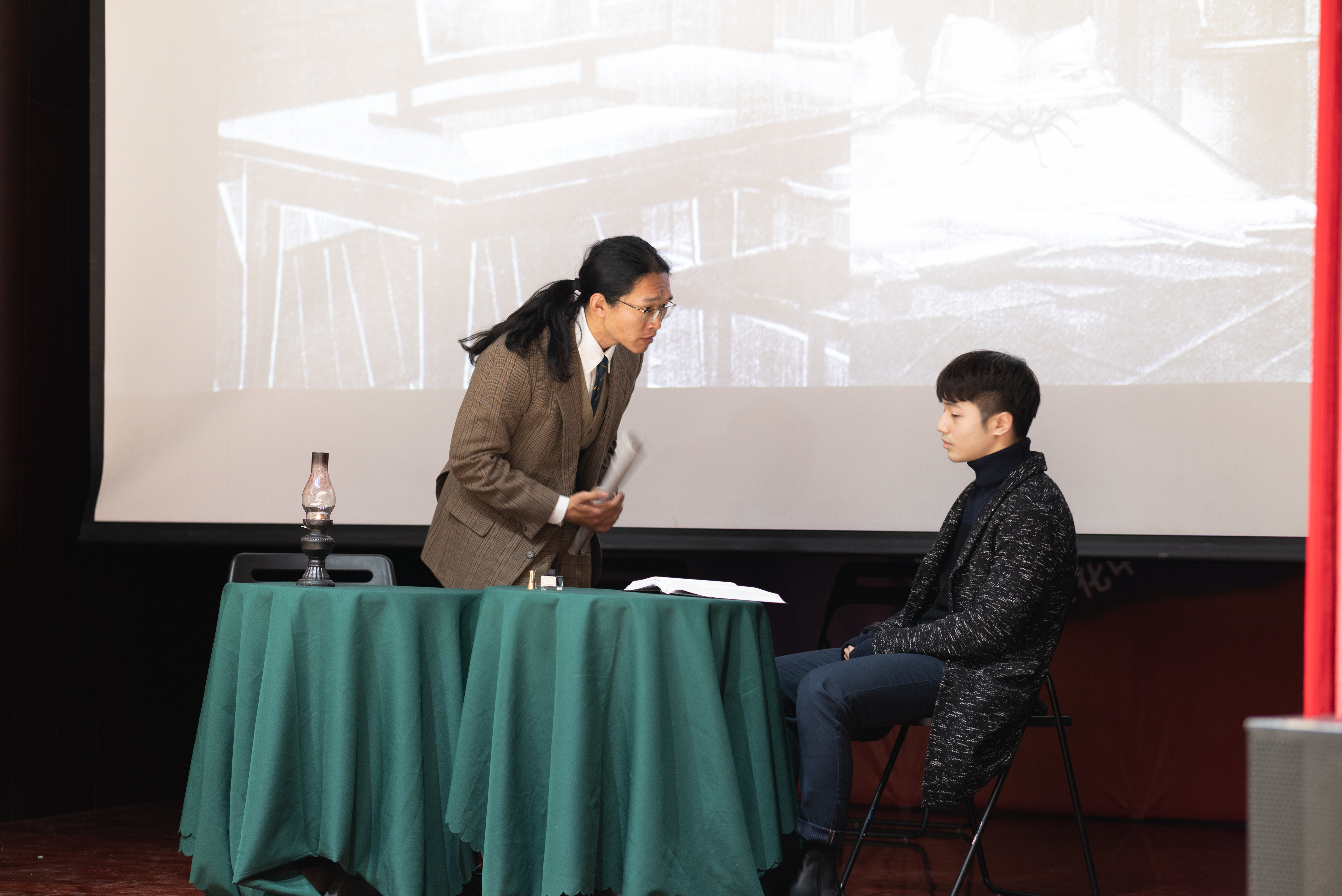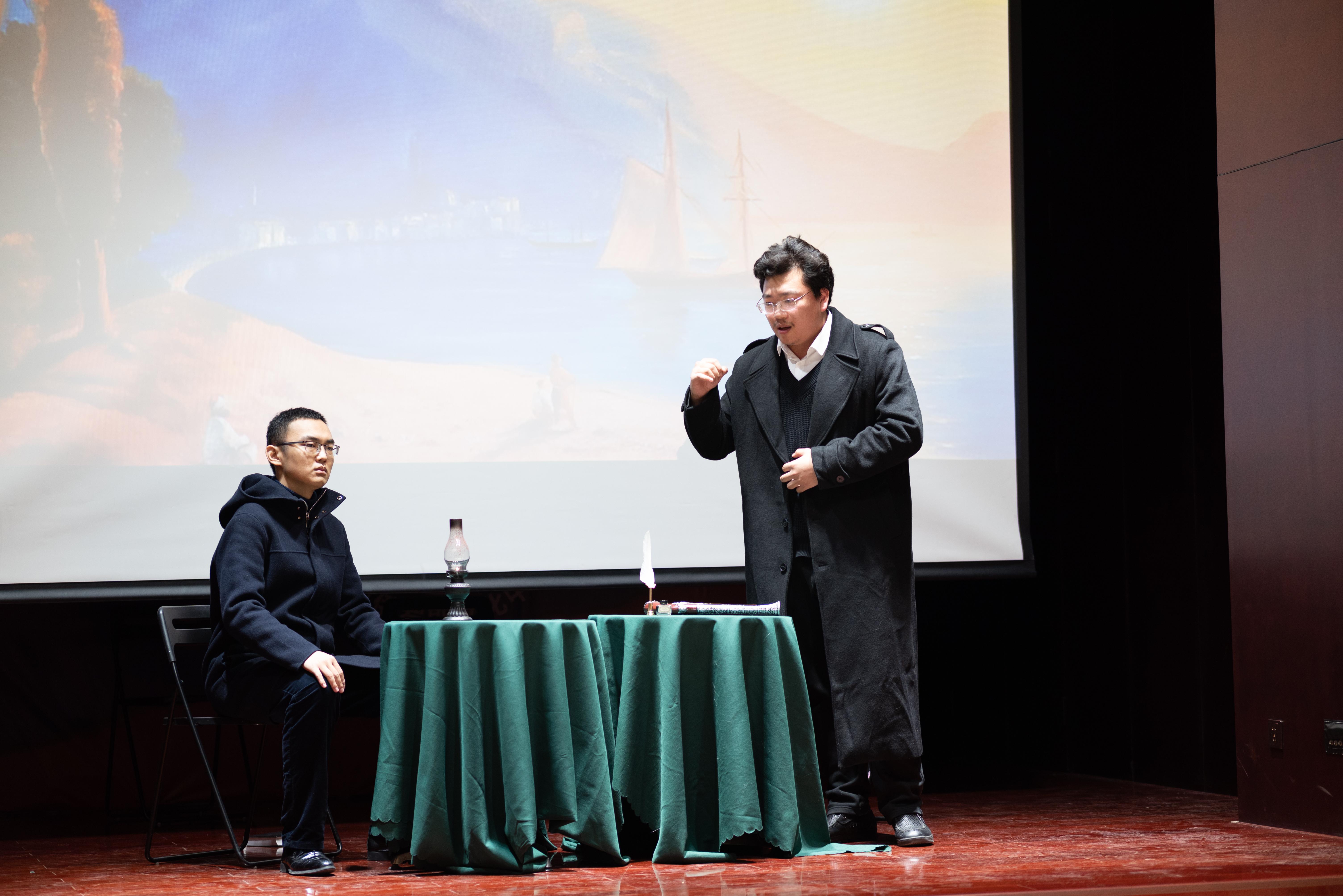 由九州体育俄罗斯语言文学系同学排演的三幕话剧«Раскольник и др.»(《拉斯柯尔尼科夫一众》)是本次活动的第五个节目。整部剧时长约十六分钟,《地下室手记》《罪与罚》《群魔》《荒唐人的梦》《卡拉马佐夫兄弟》中的主人公们轮番登场,他们在惶恐焦虑、急切不安的状态下爆发,以难以遏制的激情直抒胸臆。通过他们的表演,观众可以理解陀氏人物的内心世界,体会他们在思想上的传承、在观念上的碰撞。每幕仅五六分钟的话剧,布景道具要而不繁,汇聚传统手法和现代风尚,有力呈现了陀氏作品的精神内涵。