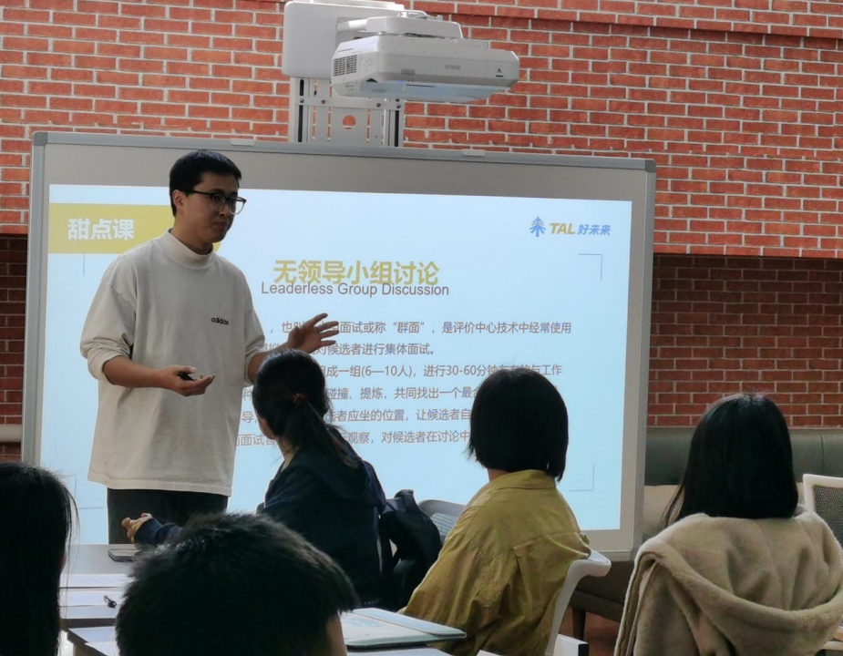 讲解环节结束后,同学们按照“体制内”和“体制外”两个不同的求职方向分成三个小组进行模拟面试。三组同学分别就“城市文明养狗问题”和“唐僧西天取经选人排序”两个题目展开讨论。一小时后,三组同学均顺利形成统一意见,按组进行团队汇报。面试期间,面试官从反应灵敏性、发言主动性、概括准确性、氛围营造力、待人尊重感等维度,对同学们的表现进行了评估。