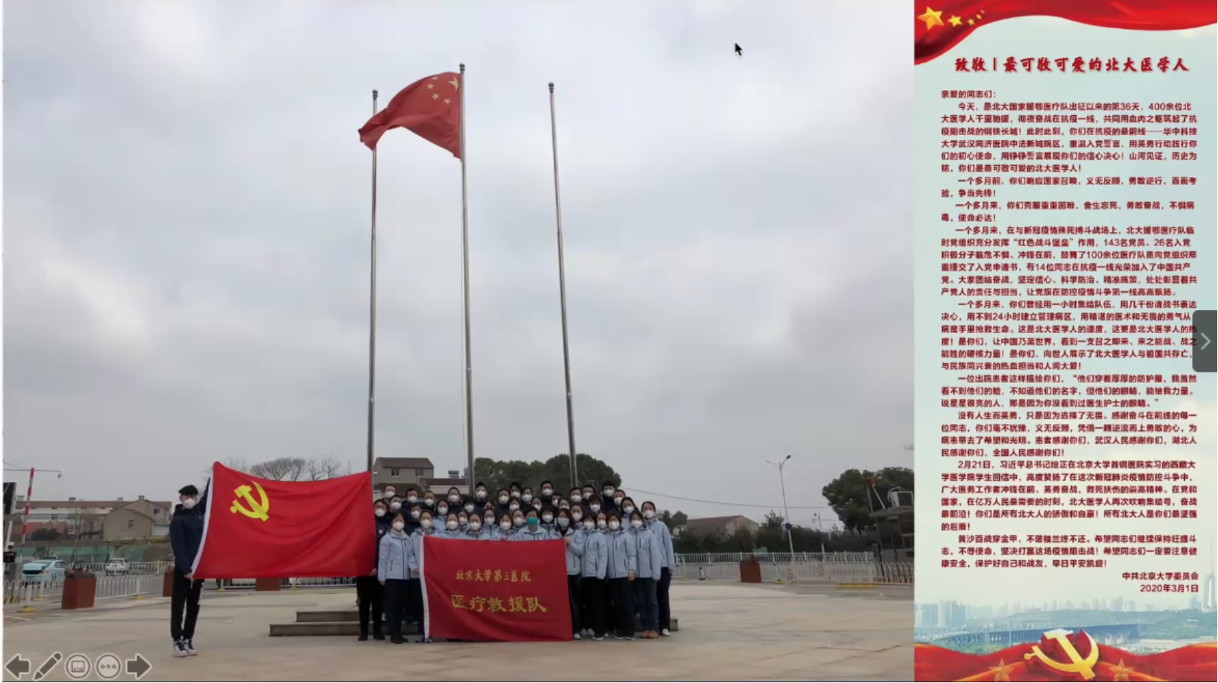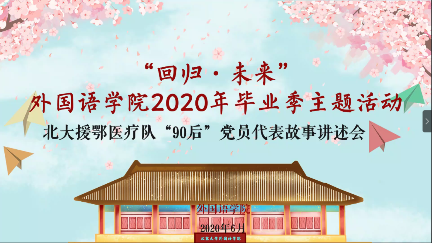 6月23日晚,外国语学院通过线上的方式举办了“回归·未来”外国语学院2020年毕业季主题活动,给毕业生们上了毕业的最后一节公开课。会上特别邀请到北京大学援鄂医疗队“90后”党员代表、北医三院医务处庄昱老师分享他在援鄂期间的经历,以及习总书记回信背后的故事。外国语学院党委书记李淑静老师、党委副书记王恒老师,以及毕业年级、非毕业年级的同学们共同参加了此次活动。活动由九州体育团委书记卢敏老师主持。