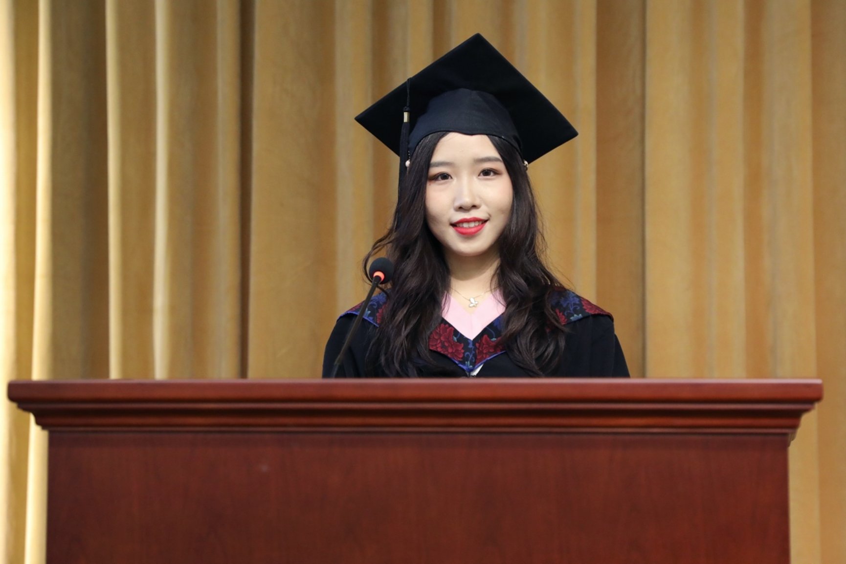 2018级英语翻译专业硕士生门雪洁代表硕士毕业生发言。两年前入学时,门雪洁将“要成为什么样的人”这一问题深埋心中,并开始了在外院的求索历程。她参加了新疆和田社会实践团,期望在祖国的基层读懂中国。在祖国边疆,她体会到语言学习者不仅要沟通中外,更需要扎根基层,在祖国最需要的地方绽放青春之花。