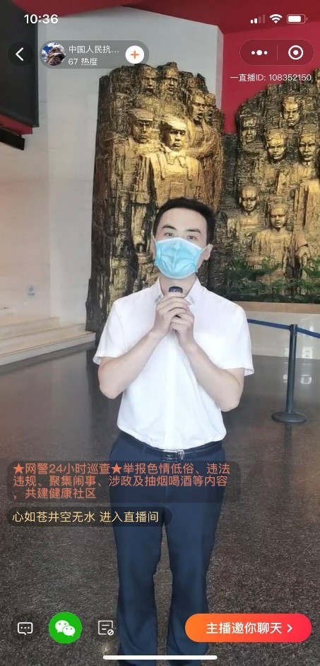 接下来课程团队跟随着专业讲解员的脚步,通过线上直播的方式“云游”纪念馆,参观了 “伟大胜利 历史贡献”大型主题展览。此次展览通过大量的史实资料和文物生动复刻了中华民族14年抗日战争的艰辛历史,给予同学们巨大的心灵震撼,引发同学们有关爱国主义与抗战精神的更为深刻的思考。