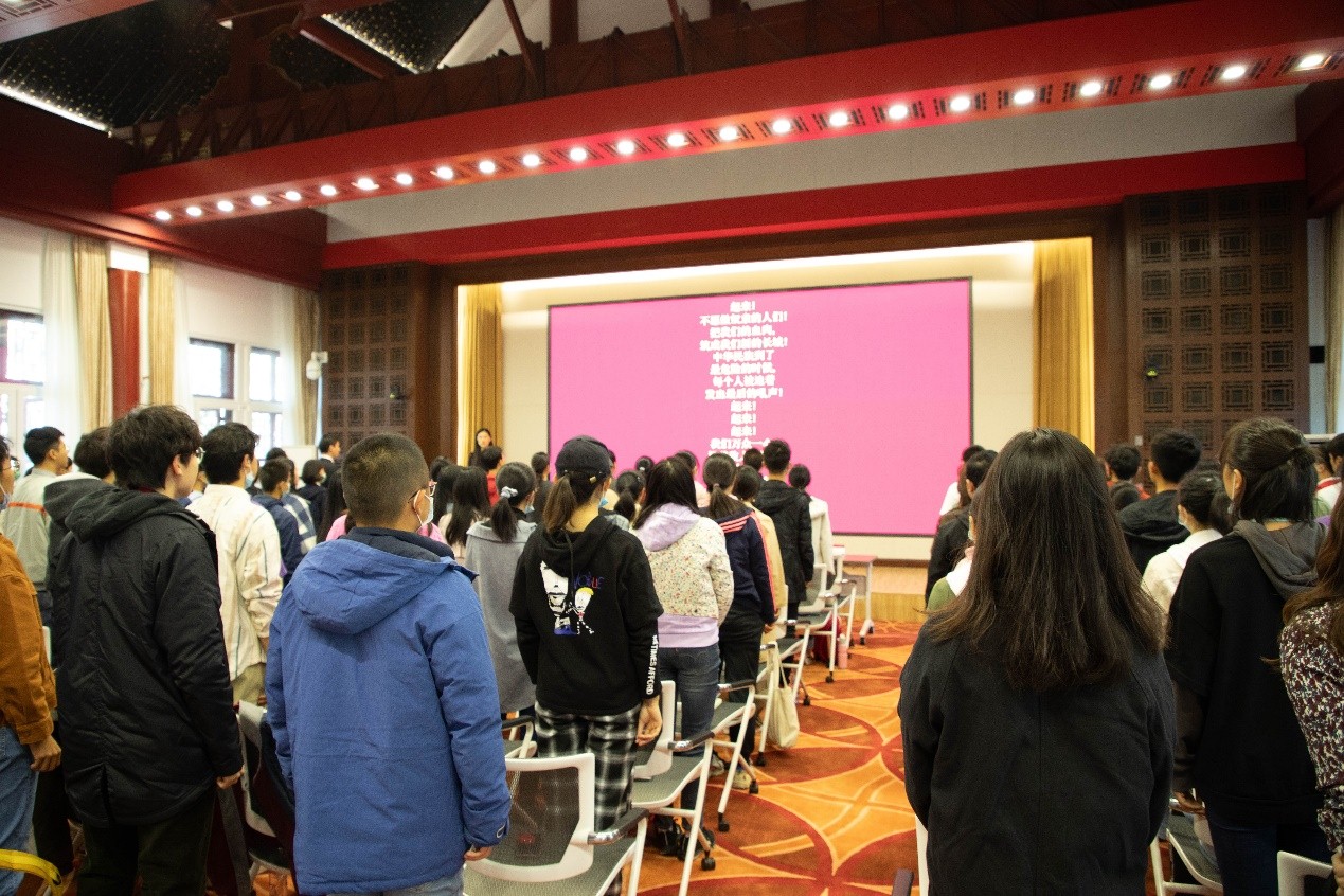 李淑静老师首先感谢校团委对外院团学工作的大力支持,并对上一学年外院团校的工作给予了充分肯定。李老师向同学们提出了三点希望:一是热爱祖国、坚定理想,她结合疫情期间外院师生、校友的辛勤工作和突出贡献,带大家体悟了“爱国是立德之源、立功之本”的深切内涵;二是指出外语学习需要不断磨练,要求同学们勤学笃实、求真力行,利用综合性资源和实践机会,积极学习有利于国家发展的知识技能;三是希望大家团结奋进、守望互助,在团校学习中广结益友,提升集体凝聚力,带动青年们奋发向上。