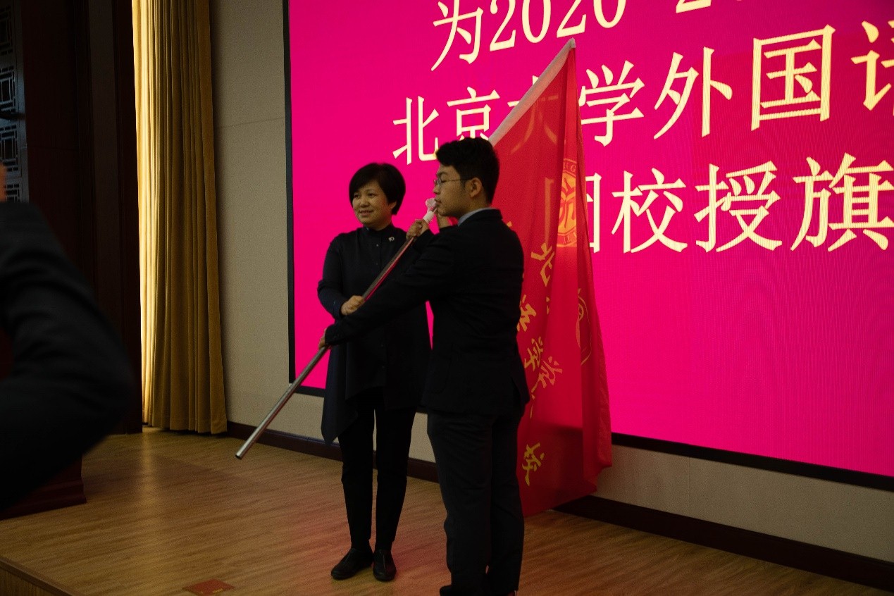 在全体学员的见证中,李淑静老师为新一届团校授旗,新生代表李泽明同学接过旗帜,象征着接力棒交到了新一届团校学员手中。