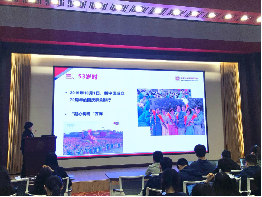 党课上,李老师与学员们分享了自己在新中国成立35周年、60周年和70周年庆典上参与群众游行方阵的难忘经历。三次参加重大活动,这不仅反映了李老师在北大成长成熟的心路历程,更映照着我们党和国家在不同时期的不同的面貌、同样的初心。李老师回忆道,1984年第一次参与游行时自己只是个初入燕园的18岁学生,她亲身感受到了从“小平您好”中体现出来的青年学生对党的拥护。那年国庆之后,李老师便向党组织提交了入党申请书。2009年,李老师以一名北大教师的身份再一次参与国庆群众游行,在“我的中国心”方阵,她深深体会到无论在中国共产党成立早期还是新中国的发展与建设中,北大始终与国家和民族的命运紧密相连,北大人在党和国家的历史中始终书写着光辉的一页。新中国成立70周年之际,李老师加入了“凝心铸魂”群众游行方阵,愈加自信地第三次走过了天安门广场,这10年间,我们的党战胜了一个又一个艰难险阻,不仅带领全国各族人民过上了更好地日子,更让我们在世界舞台上拥有了更多话语权,展示出负责任东方大国的形象。李老师表示,纵观新中国成立至今,我们之所以能取得成绩和进步,能战胜困难和险阻,一切都有赖于我们的人民,有赖于中国共产党,有赖于九千万共产党员。