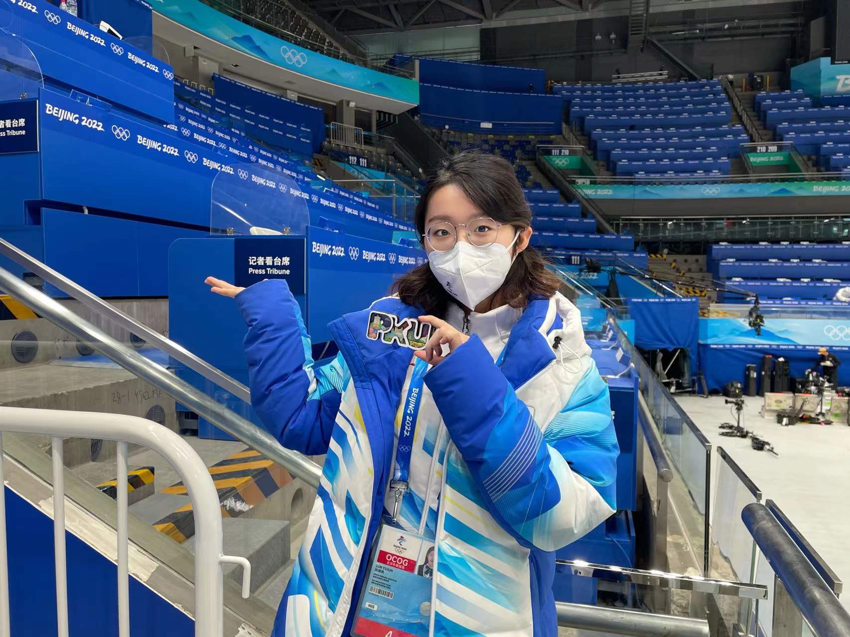 孙雨筠同学:2022年冬奥会中,外院志愿者覆盖7个场馆10个业务领域,我和惠晨原负责的都是媒体领域工作。我是记者看台席的助理。我的工作主要分为四部分:一、为来访记者提供CATV服务,控制CATV 转播显示器和内部操作;二、确保无关人员(转播商、摄影记者、队内人员等)不得进入看台区;三、赛中赛前为记者提供信息服务,赛前提供参赛阵容的信息,赛中提供每赛段的小结;四、引导服务,引导来到国家体育馆的各类人员。