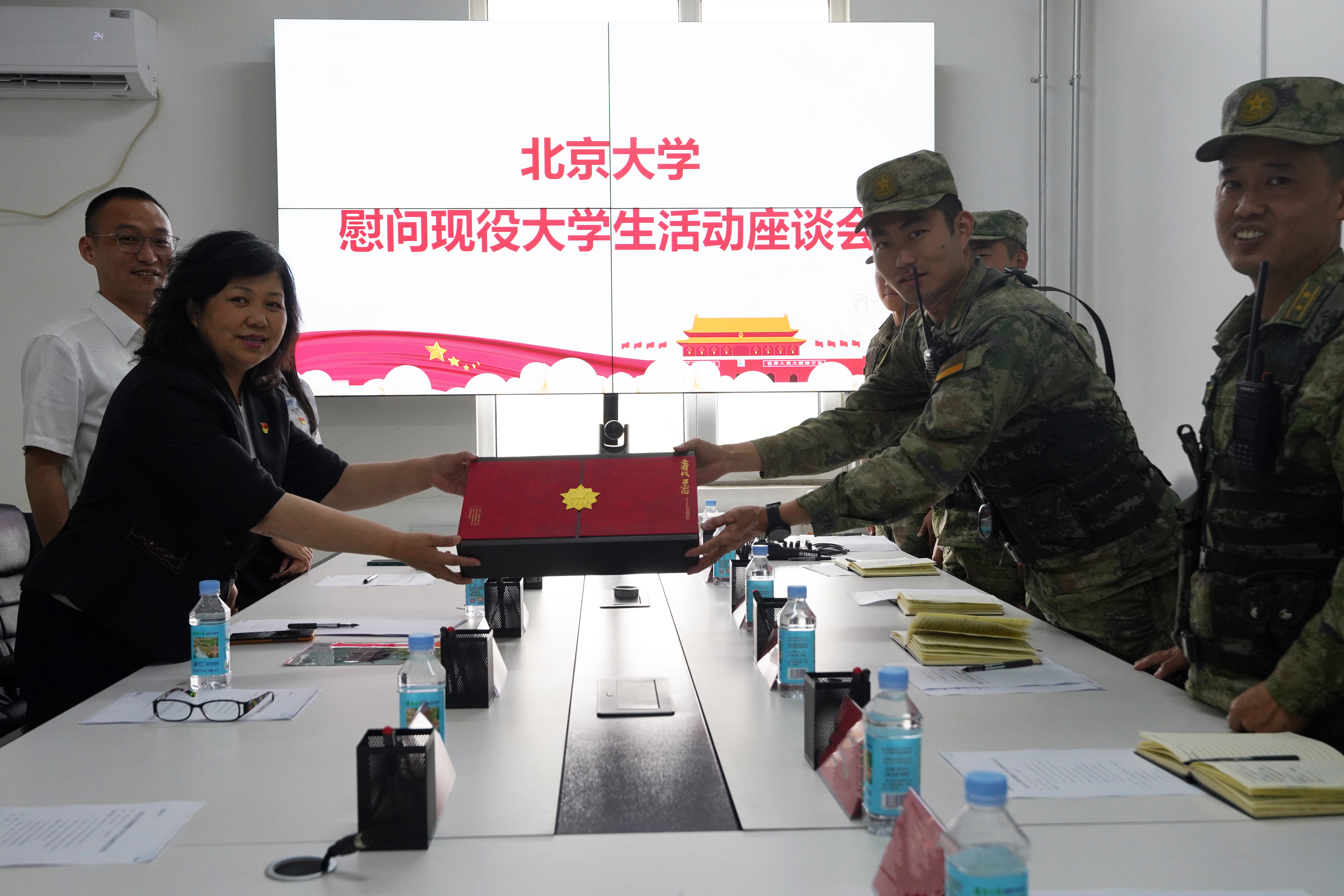 座谈结束后,双方代表互赠礼物,学院党委书记李淑静向服役大学生孙圣杰送上纪念品。
