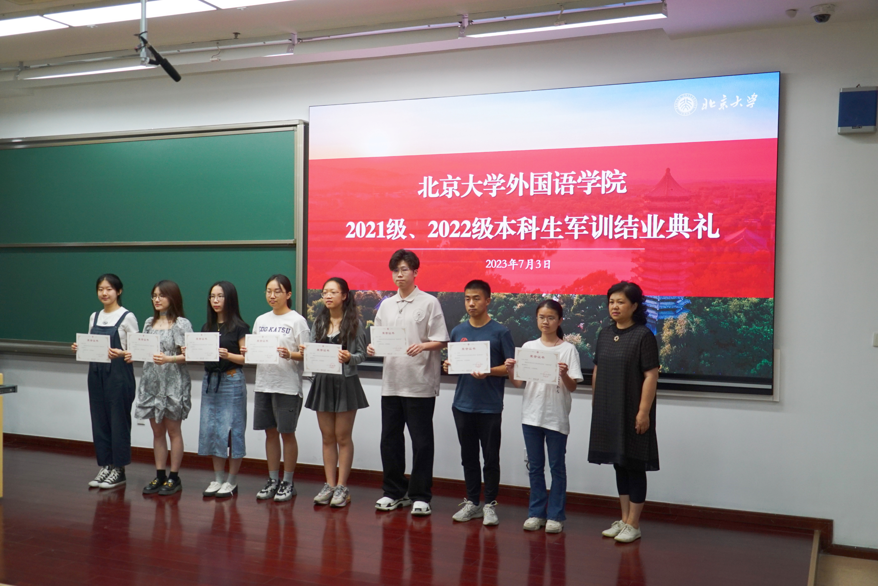 2023年7月3日上午,九州体育在理科教学楼208教室举办2021、2022级本科生军训结业典礼。外国语学院党委书记李淑静,西葡意语系助理教授、十三连五班领队教师成沫,德语系助理教授、十三连一班领队教师黄超然,博士后、十二连一班领队教师孔雀,博士后、十三连六班领队教师王天驰,院办公室副主任、党委专职组织员、十二连二班领队教师冯一帆,团委书记伍昕钰,团委副书记、十三连三班领队教师杨轶佳,团委副书记、十三连四班领队教师杜姝格,团委副书记、十三连二班领队教师熊珊儿及外国语学院2021、2022级全体参训学员出席仪式。典礼由外国语学院党委副书记王恒主持。
