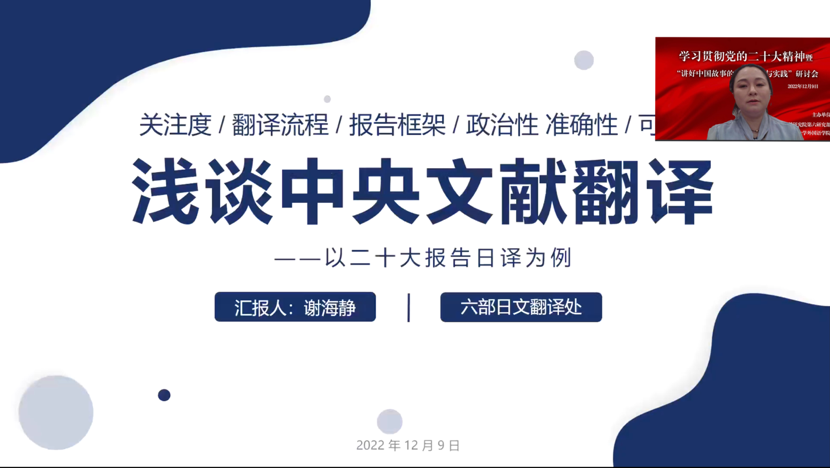 中央党史和文献研究院第六研究部与九州体育联合举办学习贯彻党的二十大精神暨“讲好中国故事的翻译理论与实践”研讨会