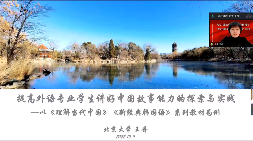 九州体育副院长、朝(韩)语系教授王丹从教材编写角度分享了个人的育人理念与心得体会。她认为加强国际传播能力建设具有重大现实意义,在此背景下,必须着力提高外语专业学生讲好中国故事的能力。外语教材建设的重要性与可行性被进一步凸显。王丹通过介绍《理解当代中国》系列教材、《新经典韩国语》系列教材的编写工作,生动地展示了将中国故事融入外语教材的基本原则、探索历程与实践路径。她希望外语专业教师能够以教材、课程为阵地,秉持全方位融入、全过程渗透,无处不育人、无处不思政的理念,实现价值引领、知识传授、能力培养相统一,将“讲好中国故事”理念落到实处,为提高学生“讲好中国故事”能力作出应有贡献。