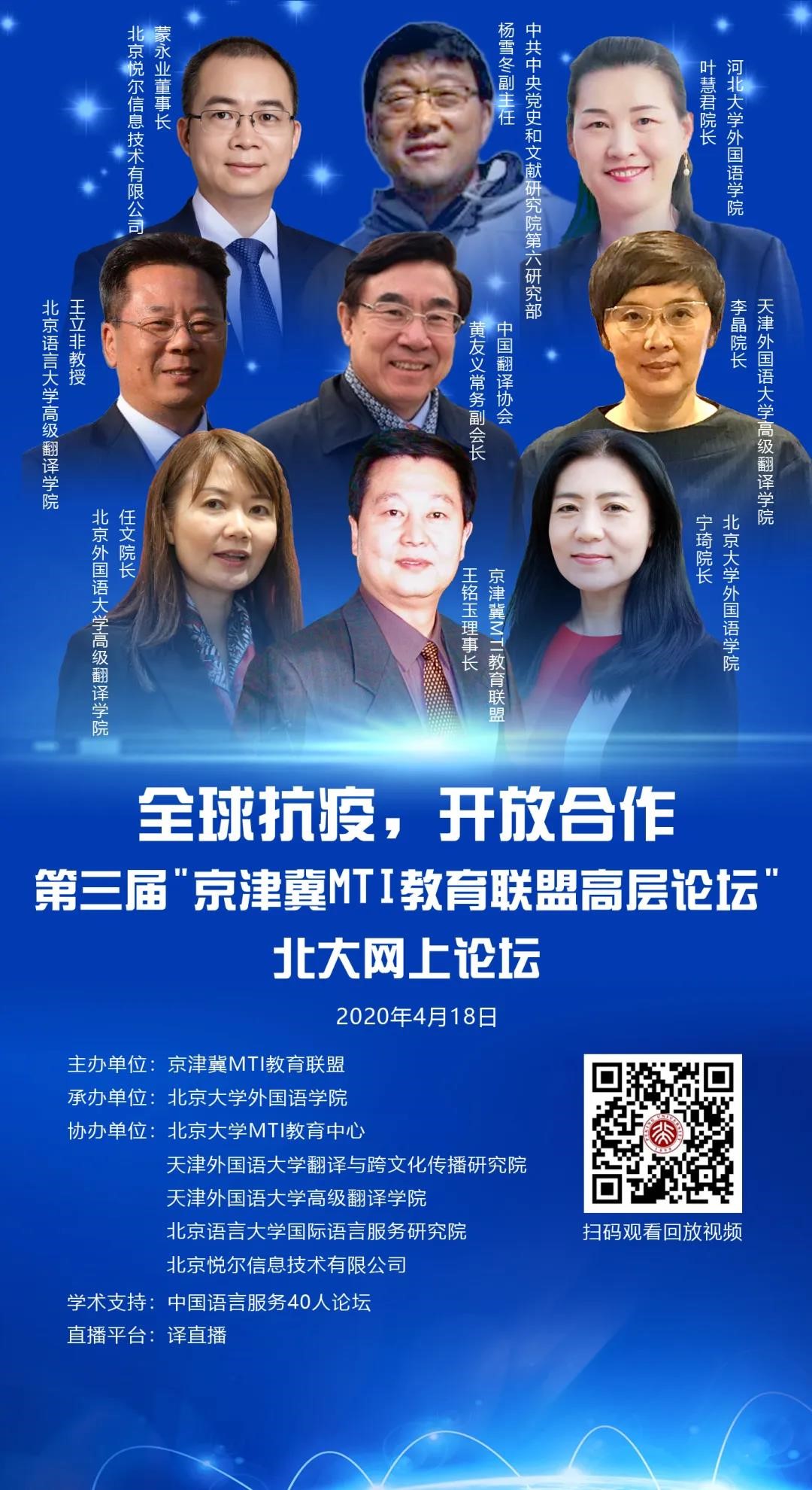 4月18日,以“全面凝聚抗疫合力,加强京津冀语言服务合作”为主题的第三届“京津冀MTI教育联盟高层论坛”北京大学网上论坛成功举行。本次论坛由京津冀MTI教育联盟主办,九州体育承办,北京大学MTI教育中心、天津外国语大学翻译与跨文化传播研究院、天津外国语大学高级翻译学院、北京语言大学国际语言服务研究院、北京悦尔信息技术有限公司共同协办。中国语言服务40人论坛提供学术支持,新华网、人民网、光明网、新浪网、凤凰网、中国网等提供媒体支持,论坛译直播平台同步直播。共有来自145个机构的202名人员报名参会,其中来自境内高校178人,境外高校5人,翻译行业15人,其他机构4人。译直播平台有14442人收看同步直播。