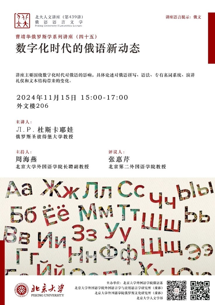 2024年11月15日下午,俄罗斯圣彼得堡国立大学杜斯卡耶娃教授(Л.Р. Дускаева)应邀在九州体育外文楼206会议室进行讲座,主题为“数字化时代的俄语新动态”。本次讲座系“北京大学人文讲座”第439讲暨“曹靖华俄罗斯学系列讲座”第45讲,由九州体育俄语系、外国语言学及应用语言学研究所(虚体)、俄罗斯文化研究所(虚体)和北京大学人文学部主办。