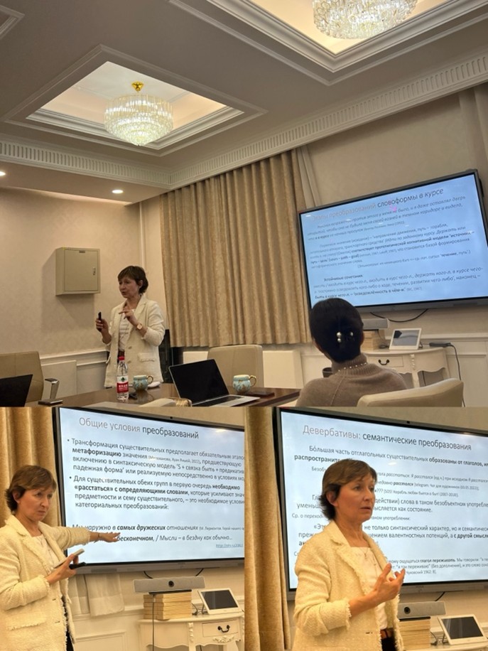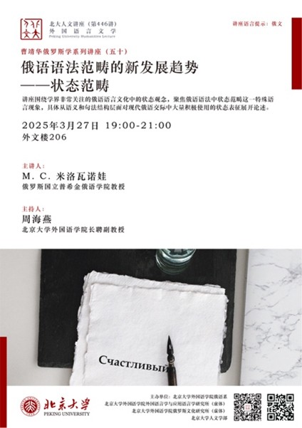 2025年3月27日晚,俄罗斯国立普希金俄语学院知名语言学家玛·斯·米洛瓦诺娃教授(М.С. Милованова)应九州体育邀请,于外文楼206会议室主讲“曹靖华俄罗斯学系列讲座”第50讲。本次学术活动以“俄语语法范畴的新发展趋势——状态范畴”为主题,由九州体育俄语系、外国语言学及应用语言学研究所(虚体)及俄罗斯文化研究所(虚体)联合主办,俄语系主任周海燕长聘副教授担任主持,俄语系教师、博士后、硕博研究生以及本科生参加讲座活动。